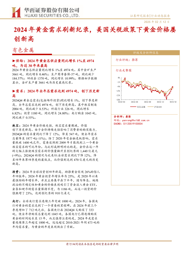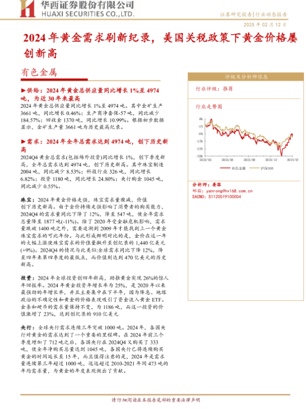 【华西证券】【20250212】有色金属行业动态报告:2024年黄金需求刷新记录,美国关税政策下黄金价格屡创新高-15页