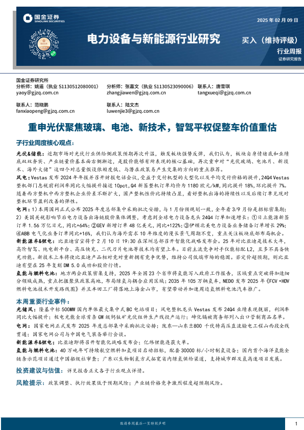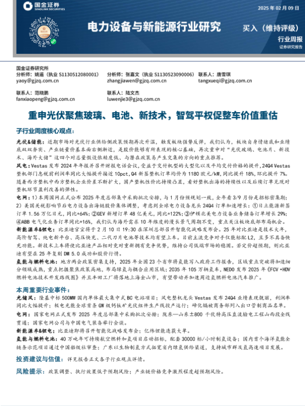 【国金证券】【20250209】电力设备与新能源行业研究:重申光伏聚焦玻璃、电池、新技术,智驾平权促整车价值重估-18页
