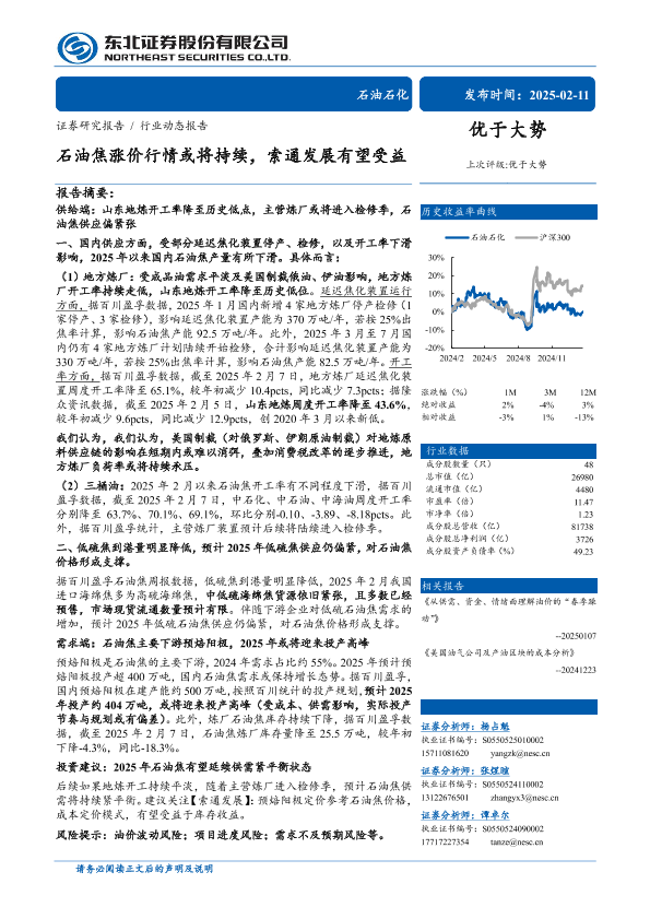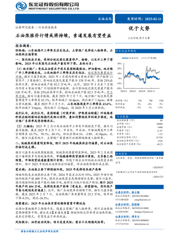 【东北证券】【20250211】石油石化行业动态报告:石油焦涨价行情或将持续,索通发展有望受益-12页