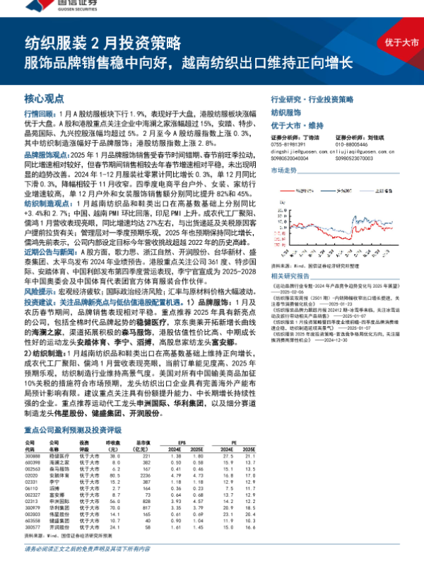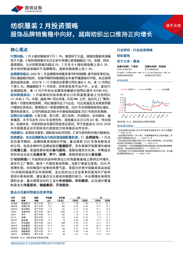 【国信证券】【202502】纺织服装行业2月投资策略:服饰品牌销售稳中向好,越南纺织出口维持正向增长-27页