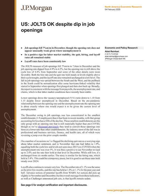 【J.P. Morgan】【20250204】JPMorgan Econ FI-US JOLTS OK despite dip in job openings-9页