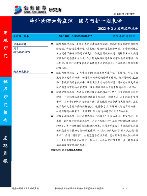 【渤海证券】【20220303】2022年3月宏观经济报告:海外紧缩如箭在弦,国内呵护一刻未停-15页