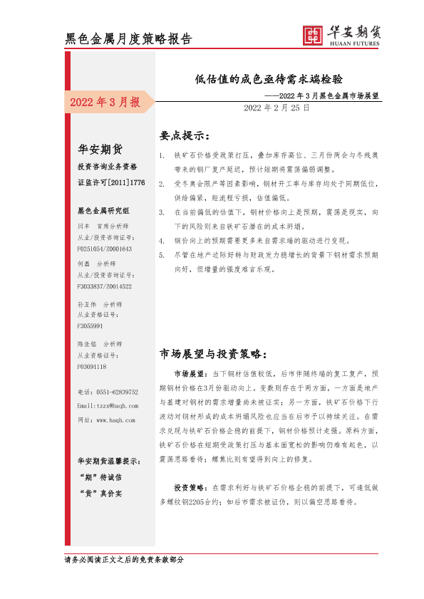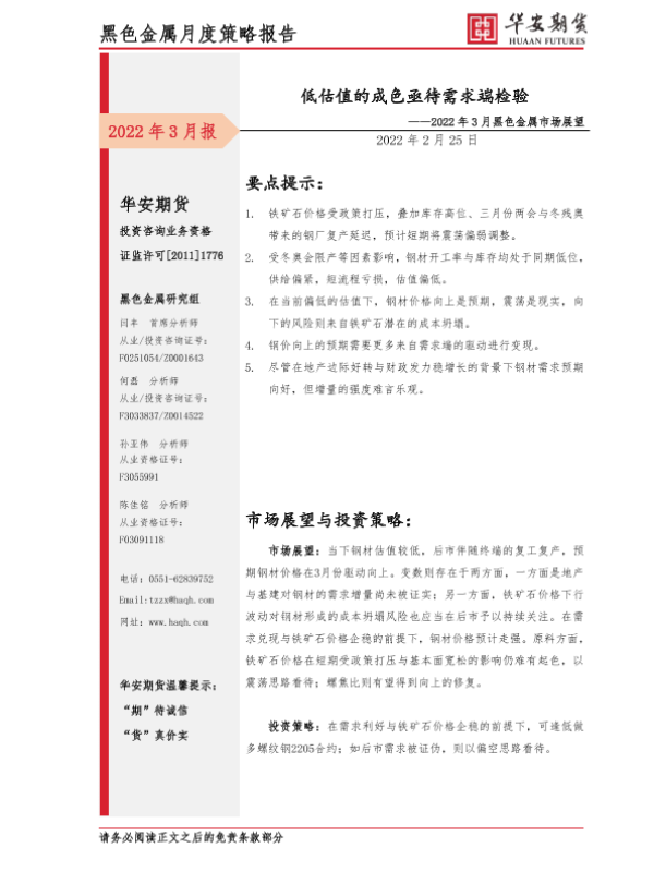 【华安期货】【20220225】2022年3月黑色金属市场展望:低估值的成色亟待需求端检验-15页