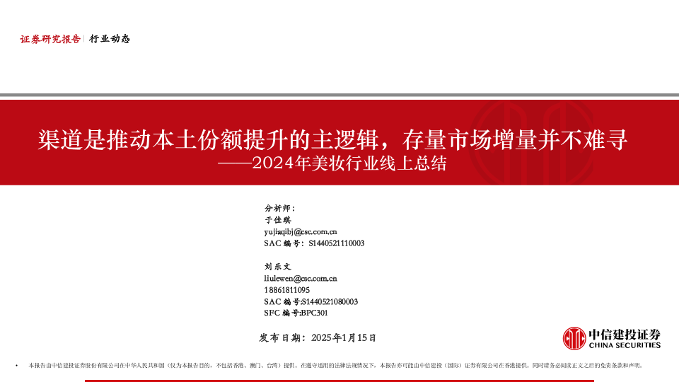 【中信建投证券】【20250115】2024年美妆行业线上总结:渠道是推动本土份额提升的主逻辑,存量市场增量并不难寻-25页