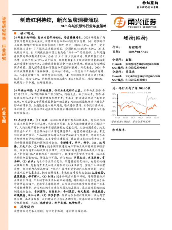 【甬兴证券】【20250116】2025年纺织服饰行业年度策略:制造红利持续,新兴品牌消费涌现-26页