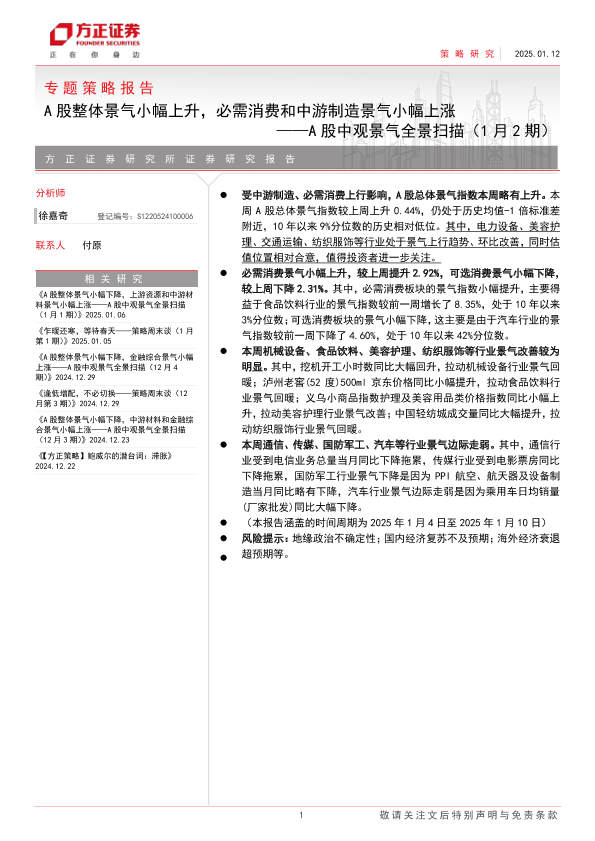 【方正证券】【20250112】A股中观景气全景扫描(1月2期):A股整体景气小幅上升,必需消费和中游制造景气小幅上涨-25页