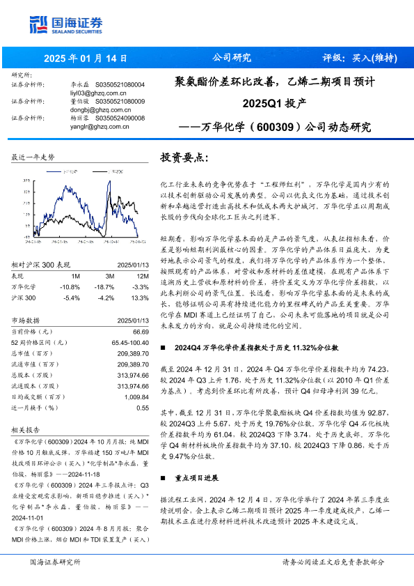 【国海证券】【20250114】万华化学(600309)公司动态研究:聚氨酯价差环比改善,乙烯二期项目预计2025Q1投产-34页