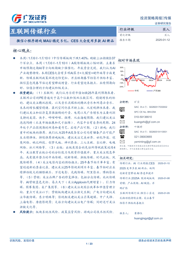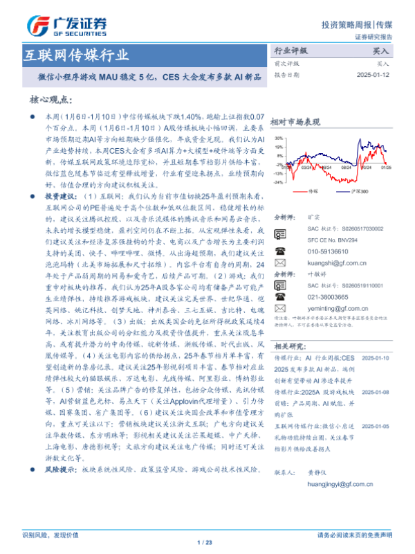【广发证券】【20250112】互联网传媒行业:微信小程序游戏MAU稳定5亿,CES大会发布多款AI新品-23页