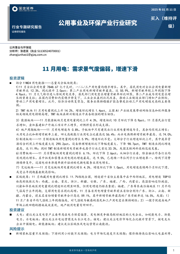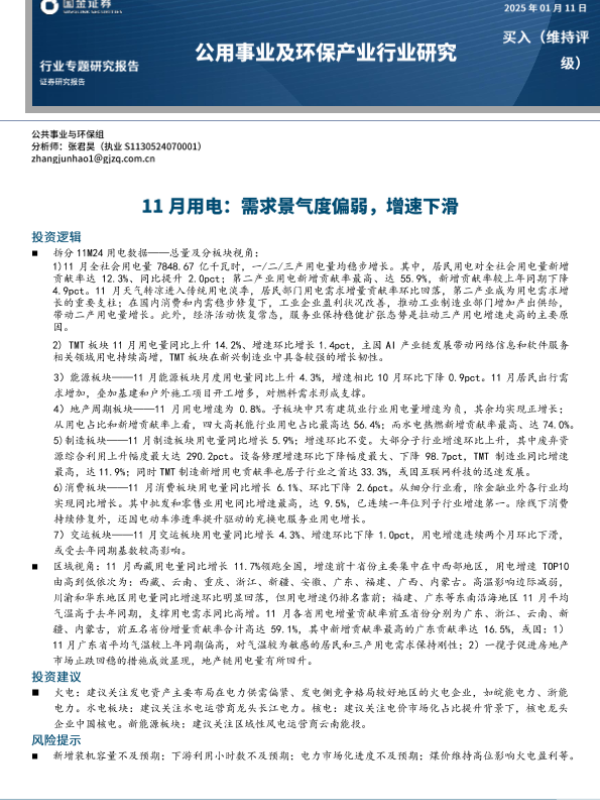 【国金证券】【20250111】公用事业及环保产业行业研究:11月用电,需求景气度偏弱,增速下滑-16页