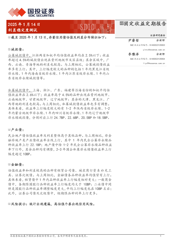 【国投证券】【20250114】固定收益定期报告:利差稳定度测试-19页