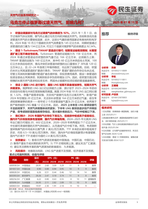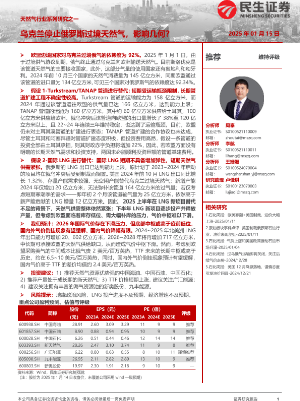 【民生证券】【20250115】天然气行业系列研究之一:乌克兰停止俄罗斯过境天然气,影响几何?-15页
