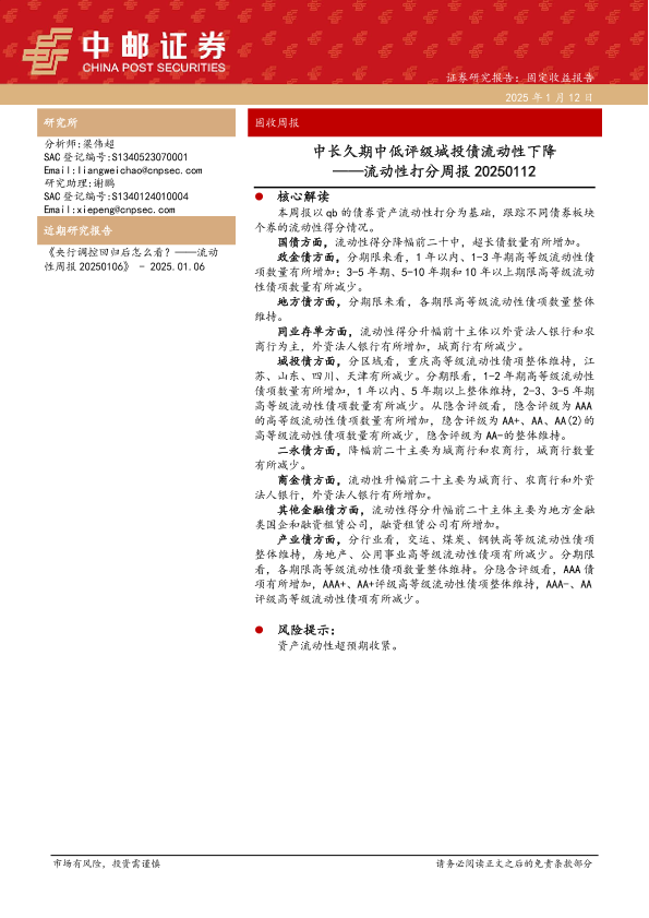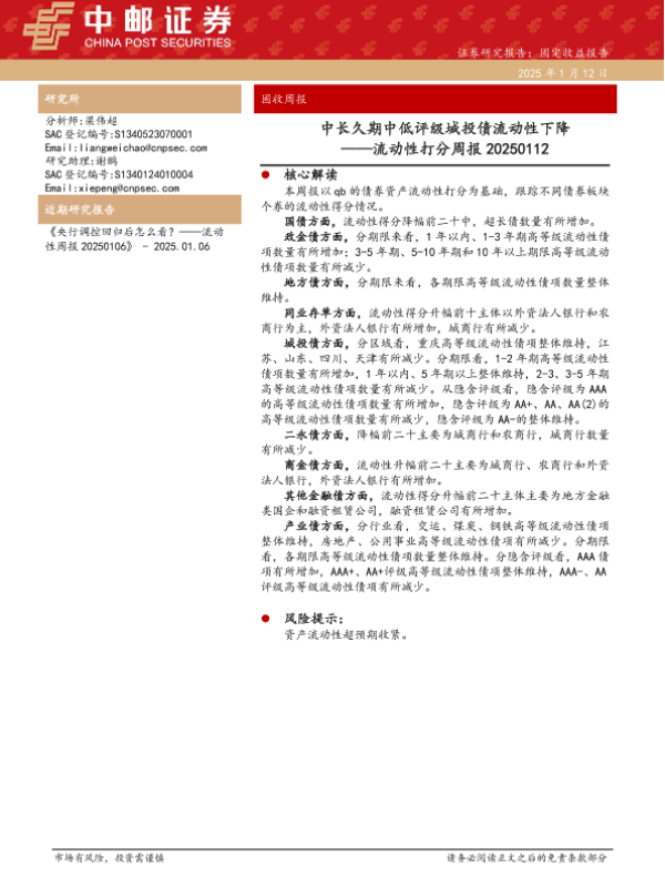 【中邮证券】【20250112】流动性打分:中长久期中低评级城投债流动性下降-38页
