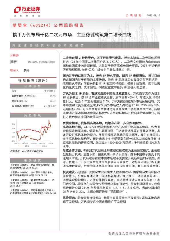 【方正证券】【20250110】爱婴室(603214)公司跟踪报告:携手万代布局千亿二次元市场,主业稳健构筑第二增长曲线-18页