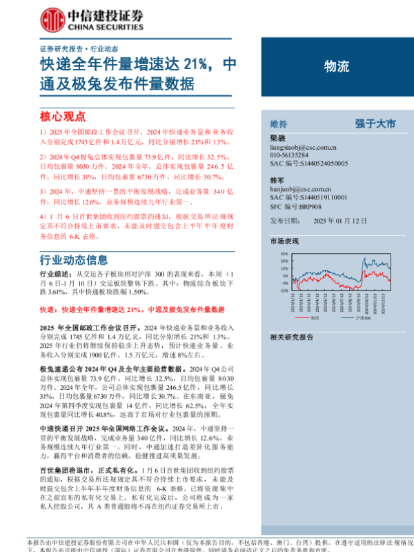 【中信建投证券】【20250112】物流行业动态:快递全年件量增速达21%,中通及极兔发布件量数据-19页