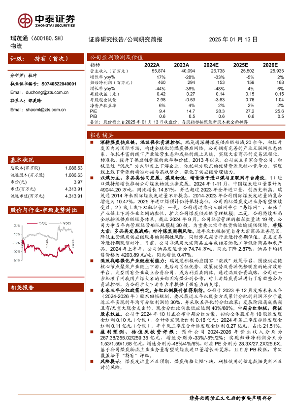 【中泰证券】【20250113】瑞茂通(600180)深耕煤炭供应链,进口增长可期待-14页
