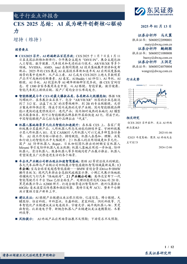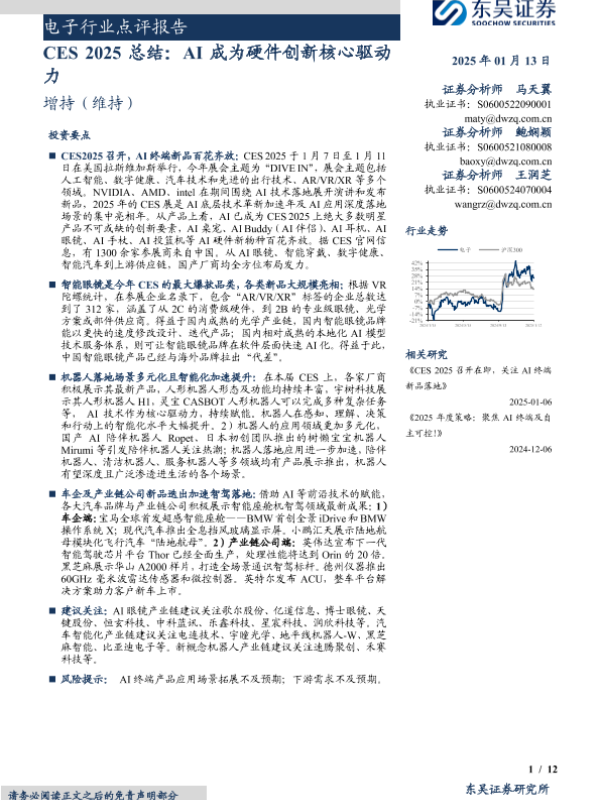 【东吴证券】【20250113】电子行业点评报告:CES+2025总结,AI成为硬件创新核心驱动力-12页