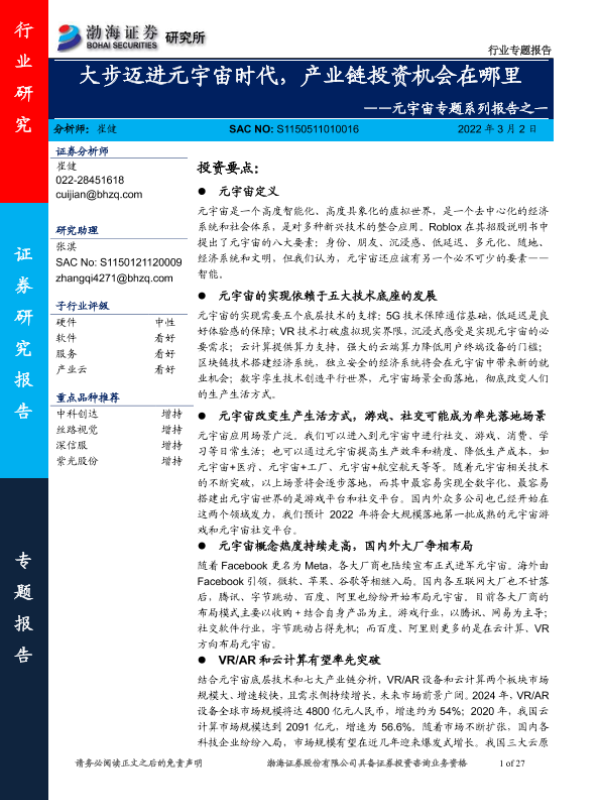 【渤海证券】【20220302】传媒行业元宇宙专题系列报告之一:大步迈进元宇宙时代,产业链投资机会在哪里-27页