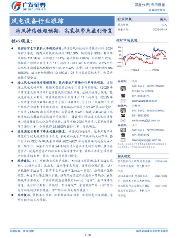 【广发证券】【20250114】风电设备行业跟踪:海风持续性超预期,高装机带来盈利修复-30页