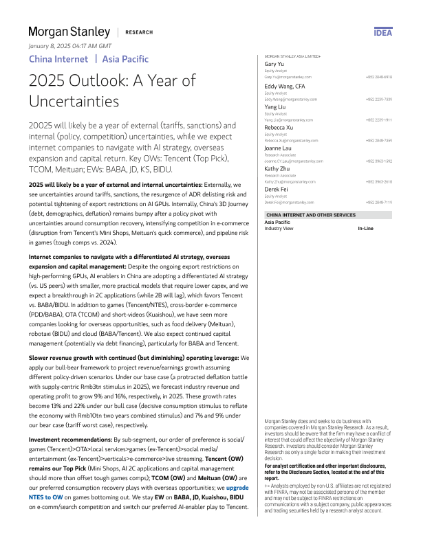 【Morgan Stanley】【2025】China Internet 2025 Outlook A Year of Uncertainties-20页