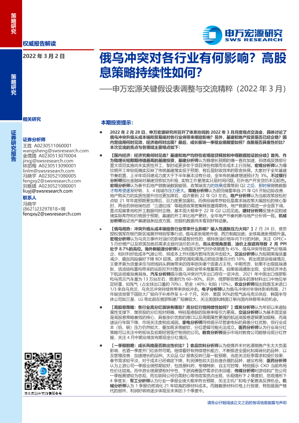 【申万宏源】【20220302】关键假设表调整与交流精粹(2022年3月):俄乌冲突对各行业有何影响?高股息策略持续性如何?-24页