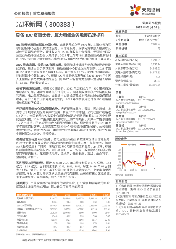 【天风证券】【20250109】光环新网(300383)具备IDC资源优势,算力租赁业务规模迅速提升-12页