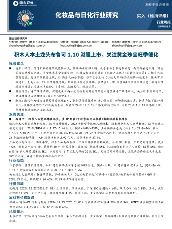 【国金证券】【20250105】化妆品与日化行业研究:积木人本土龙头布鲁可1.10港股上市,关注黄金珠宝旺季催化-11页