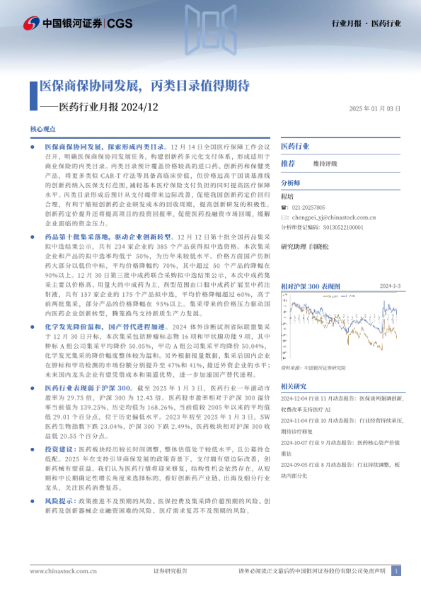 【银河证券】【20250103】医药行业月报:医保商保协同发展,丙类目录值得期待-14页