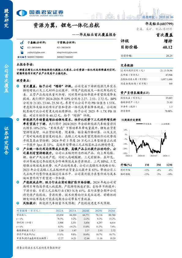 【国泰君安证券】【20250106】华友钴业(603799)首次覆盖报告:资源为翼,锂电一体化启航-32页