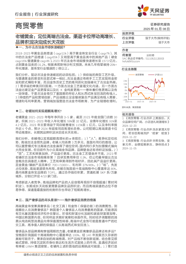 【天风证券】【20250108】商贸零售行业老铺黄金:定位高端古法金,渠道卡位带动高增长、品牌积淀决定成长天花板-26页