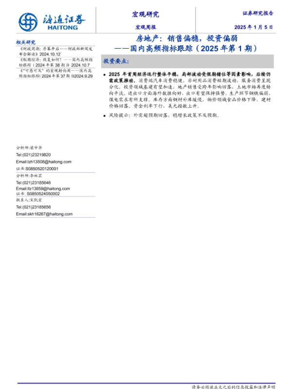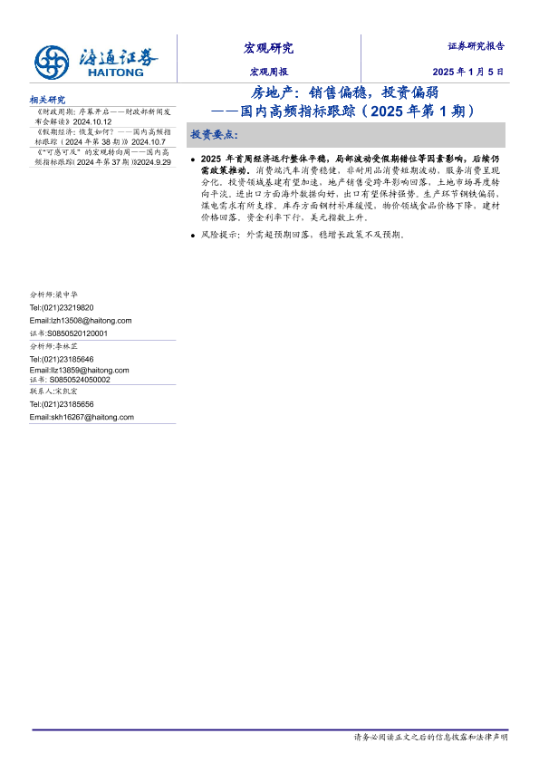 【海通证券】【20250105】国内高频指标跟踪(2025年第1期):房地产,销售偏稳,投资偏弱-11页