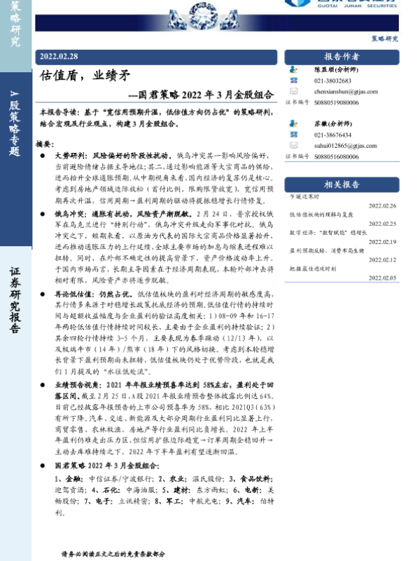 【国泰君安证券】【20220228】国君策略2022年3月金股组合:估值盾,业绩矛-21页