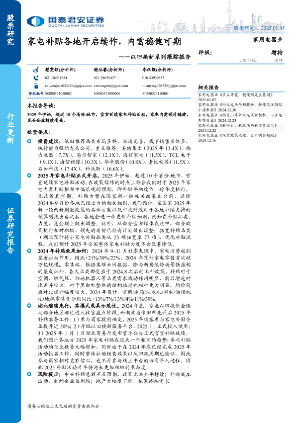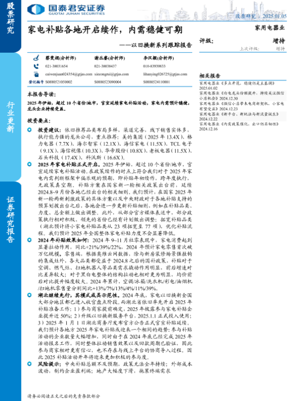 【国泰君安证券】【20250105】家用电器行业以旧换新系列跟踪报告:家电补贴各地开启续作,内需稳健可期-11页