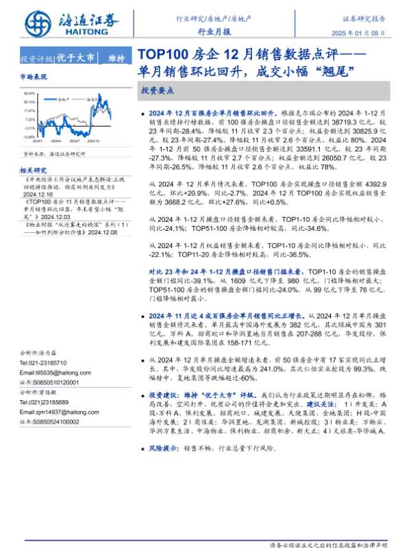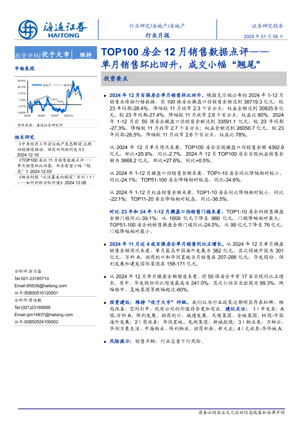 【海通证券】【20250105】房地产行业TOP100房企12月销售数据点评:单月销售环比回升,成交小幅“翘尾”-10页
