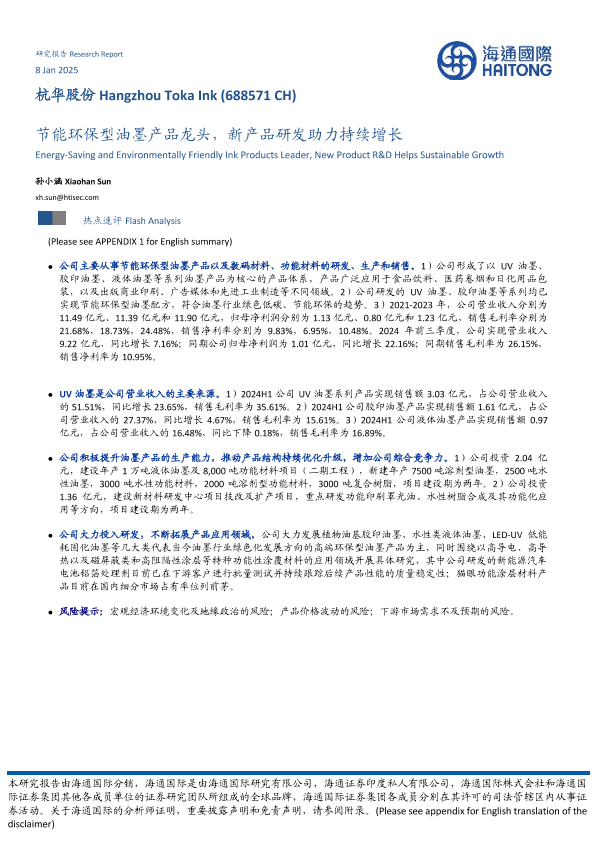 【海通国际】【20250108】杭华股份(688571)节能环保型油墨产品龙头,新产品研发助力持续增长-13页