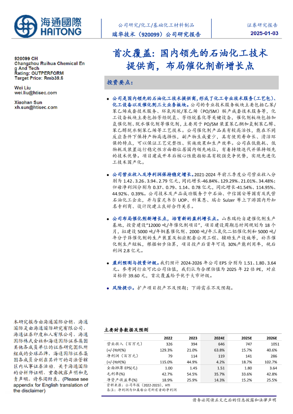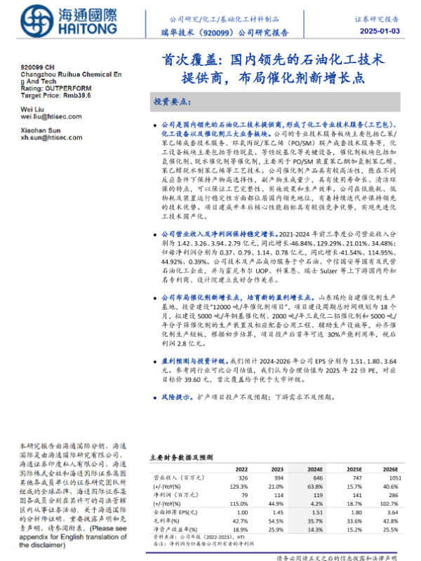 【海通国际】【20250103】瑞华技术(920099)首次覆盖:国内领先的石油化工技术提供商,布局催化剂新增长点-12页