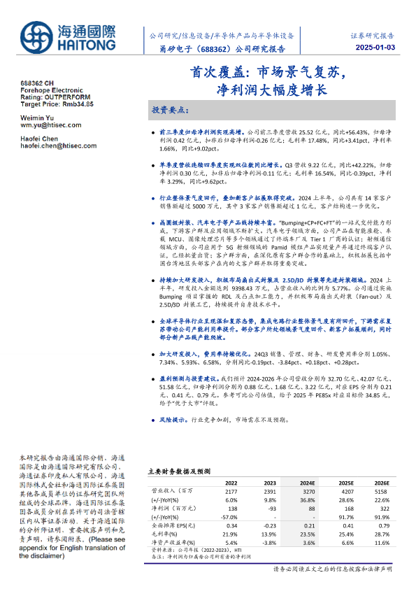 【海通国际】【20250102】甬矽电子(688362)首次覆盖:市场景气复苏,净利润大幅度增长-12页