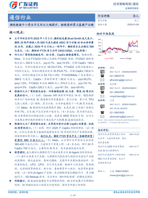 【广发证券】【20250105】通信行业:微软数据中心资本开支同比大幅提升,继续看好算力基建产业链-17页