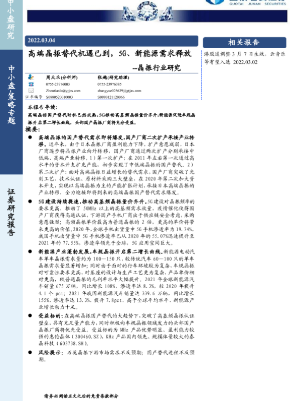 【国泰君安证券】【20220304】高端晶振替代机遇已到,5G、新能源需求释放 -- 晶振行业研究-23页