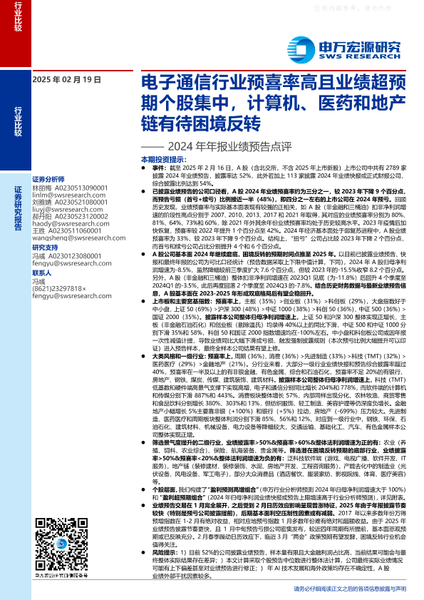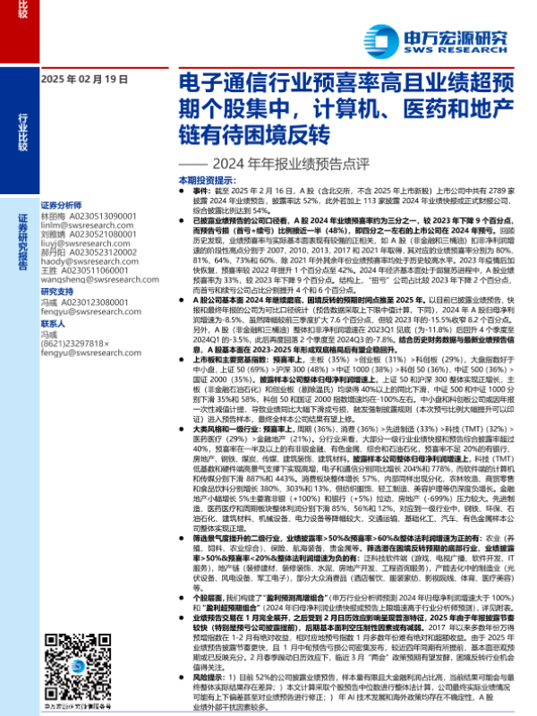 【申万宏源】【20250219】2024年年报业绩预告点评:电子通信行业预喜率高且业绩超预期个股集中,计算机、医药和地产链有待困境反转-14页