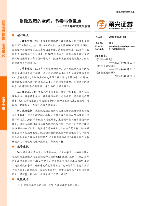【甬兴证券】【20250212】2025年财政政策前瞻:财政政策的空间、节奏与侧重点-15页