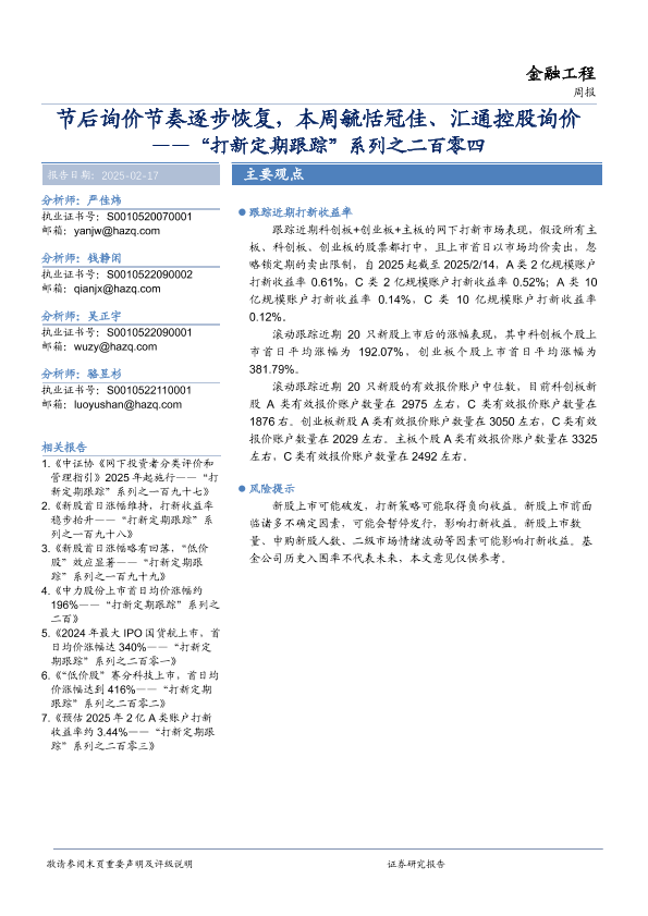 【华安证券】【20250217】“打新定期跟踪”系列之二百零四:节后询价节奏逐步恢复,本周毓恬冠佳、汇通控股询价-14页