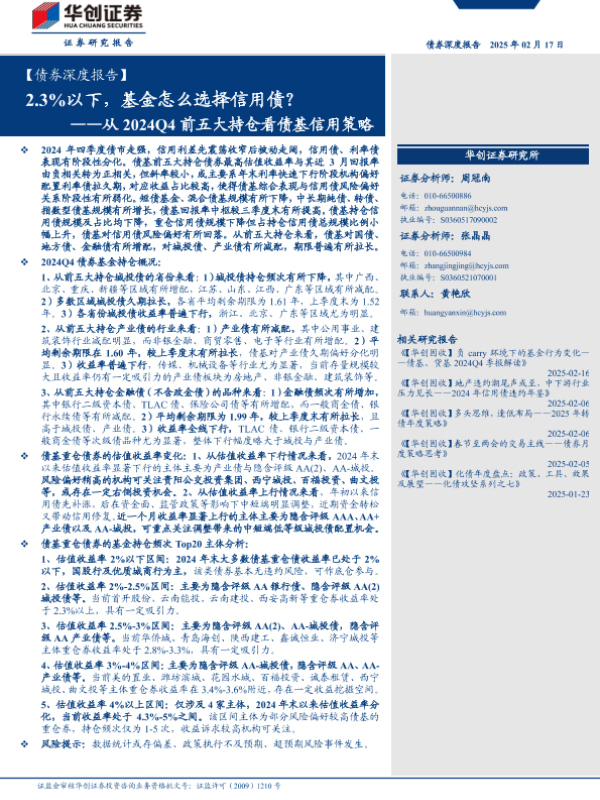 【华创证券】【20250217】从2024Q4前五大持仓看债基信用策略:2.3%以下,基金怎么选择信用债?-20页