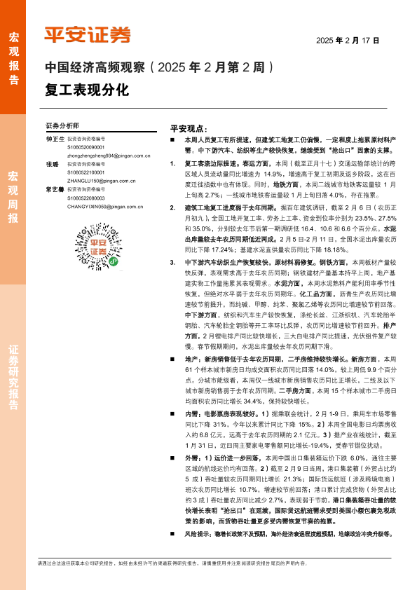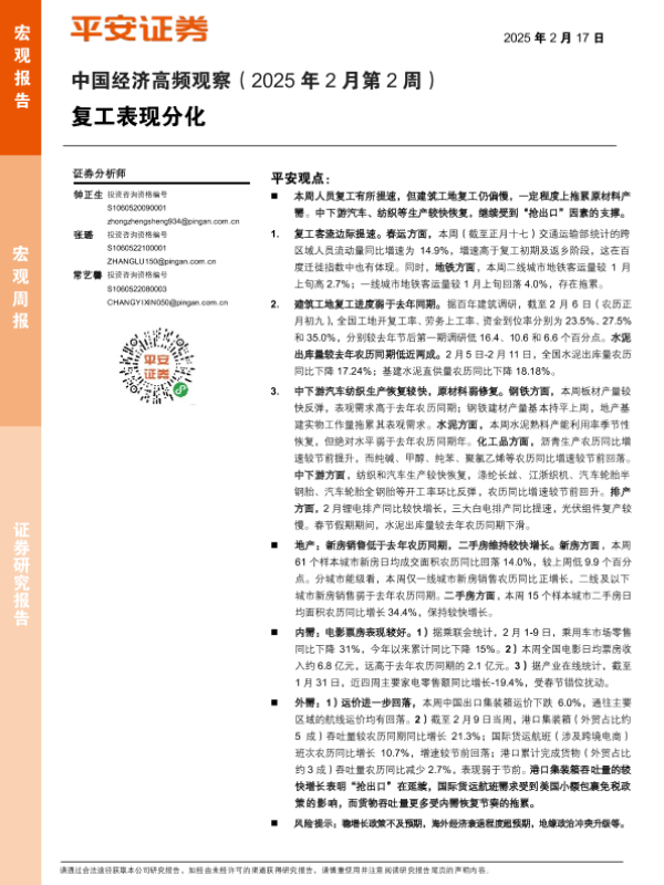 【平安证券】【20250217】中国经济高频观察(2025年2月第2周):复工表现分化-13页