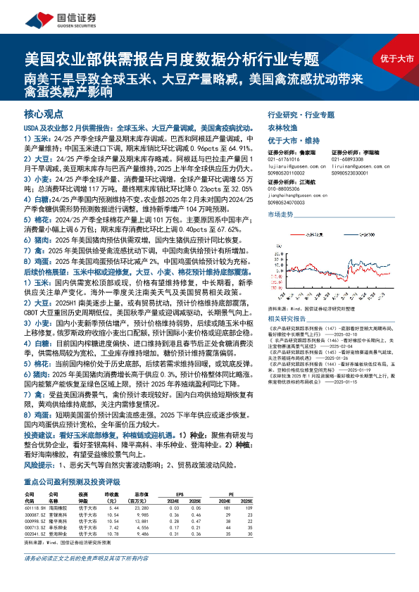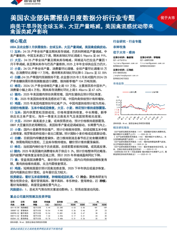 【国信证券】【20250216】农林牧渔行业美国农业部供需报告月度数据分析行业专题:南美干旱导致全球玉米、大豆产量略减,美国禽流感扰动带来禽蛋类减产影响-30页