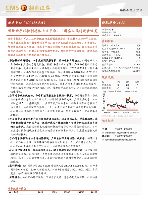 【海通证券】【20250220】北方导航(600435)稀缺的导航控制总体上市平台,下游需求或将逐步恢复-27页