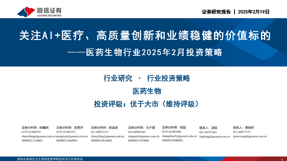 【国信证券】【20250219】医药生物行业2025年2月投资策略:关注AI+医疗、高质量创新和业绩稳健的价值标的-35页