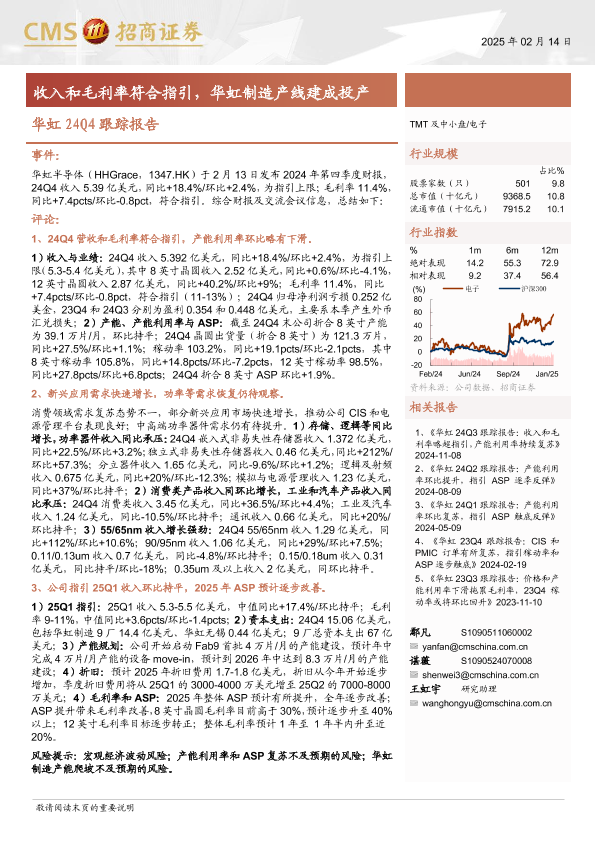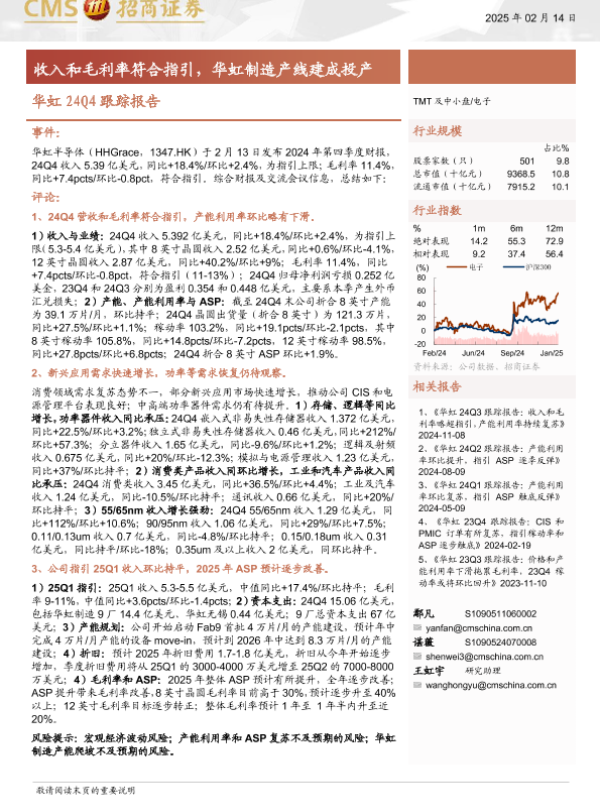 【海通证券】【20250214】电子行业华虹24Q4跟踪报告:收入和毛利率符合指引,华虹制造产线建成投产-15页