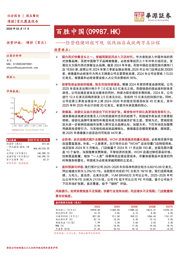 【华源证券】【20250217】百胜中国(09987.HK)经营稳健回报可观,低线拓店成就两万店征程-26页
