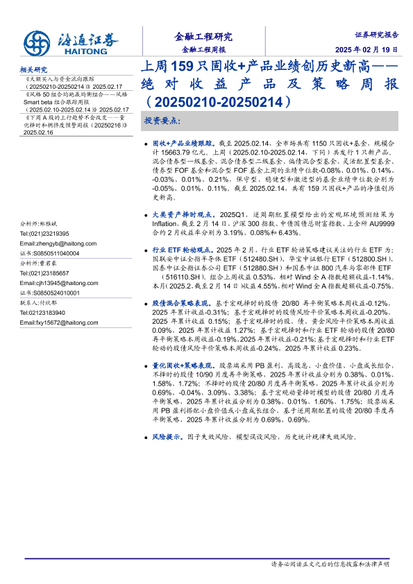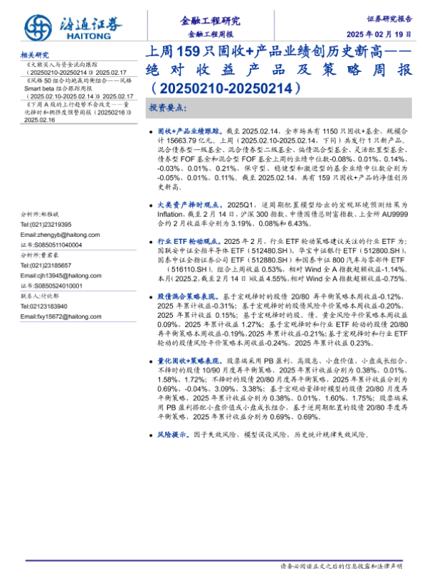 【海通证券】【20250219】绝对收益产品及策略:上周159只固收+产品业绩创历史新高-12页
