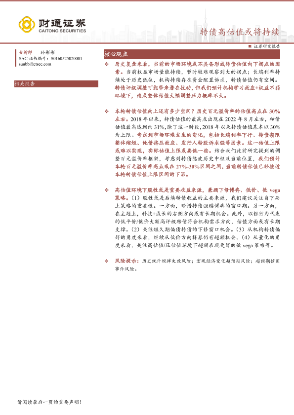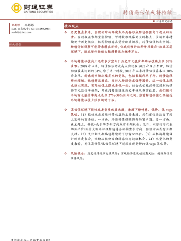 投资策略 证券研究 转债估值 金融市场 高估值持续性
